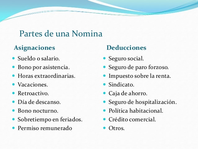 žLa nómina es un documento de naturaleza contable, con validez legal, donde se especifica la relación de pago, por lo tanto, en ella se debe reflejar el salario base del empleado, sobre el cual se harán las deducciones o retenciones de rigor. A esta cantidad se le sumarán los complementos salariales, que podrán ser por antigüedad, rango, formación, riesgos laborales, horas extras, bonificaciones, por objetivos, entre otros.. La sumatoria total de estos ítems dará como resultado el sueldo bruto del trabajador.